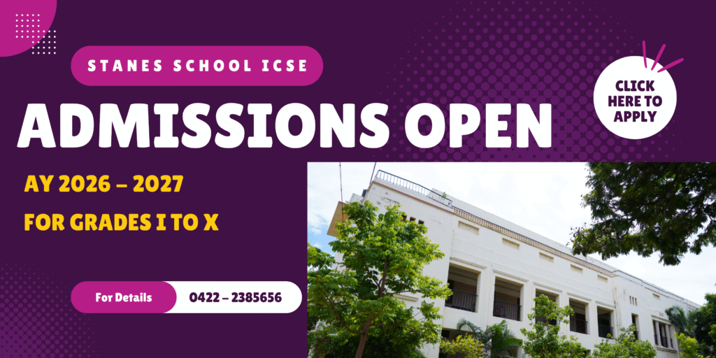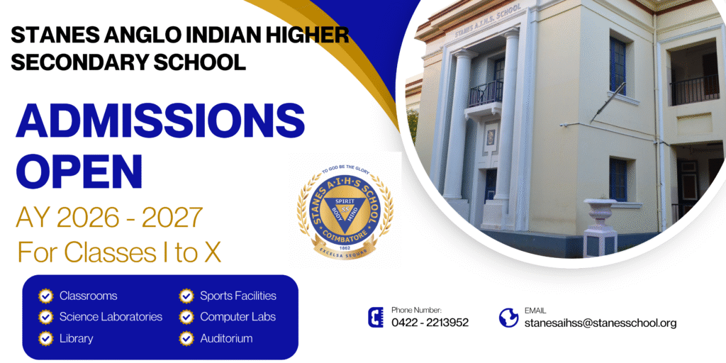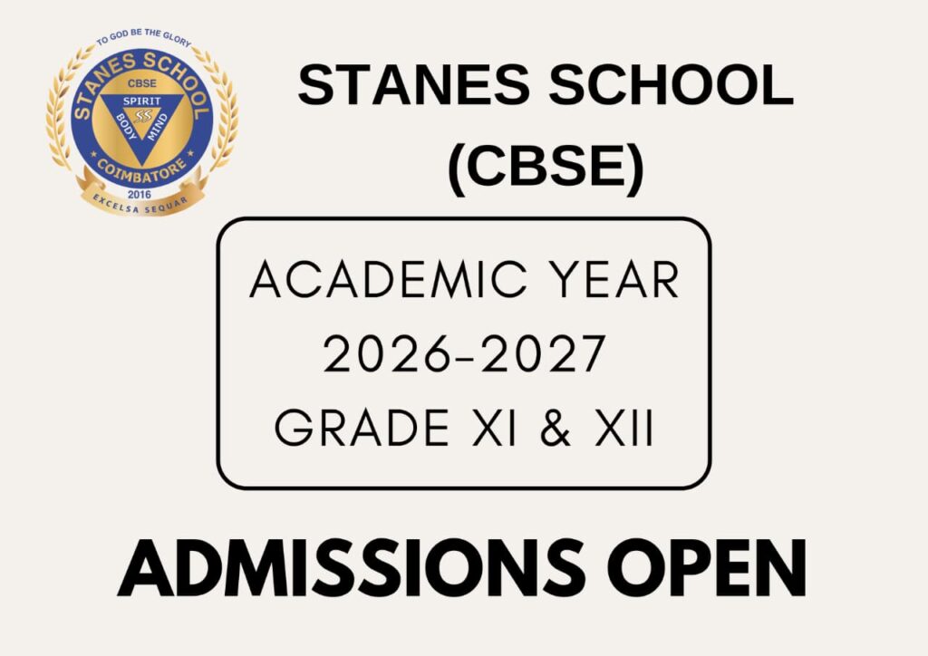 STANES NURSERY SCHOOL PRE-KG, LKG & UKG STANES ANGLO-INDIAN HIGHER SECONDARY SCHOOL SAMACHEER - CLASSES I TO X STANES SCHOOL - ICSE / ISC ICSE STREAM - GRADES I TO X STANES SCHOOL CBSE CBSE STREAM - GRADES I TO X CBSE STREAM - GRADES XI & XII STANES INTERNATIONAL SCHOOL CAMBRIDGE SYLLABUS - GRADES I TO IV